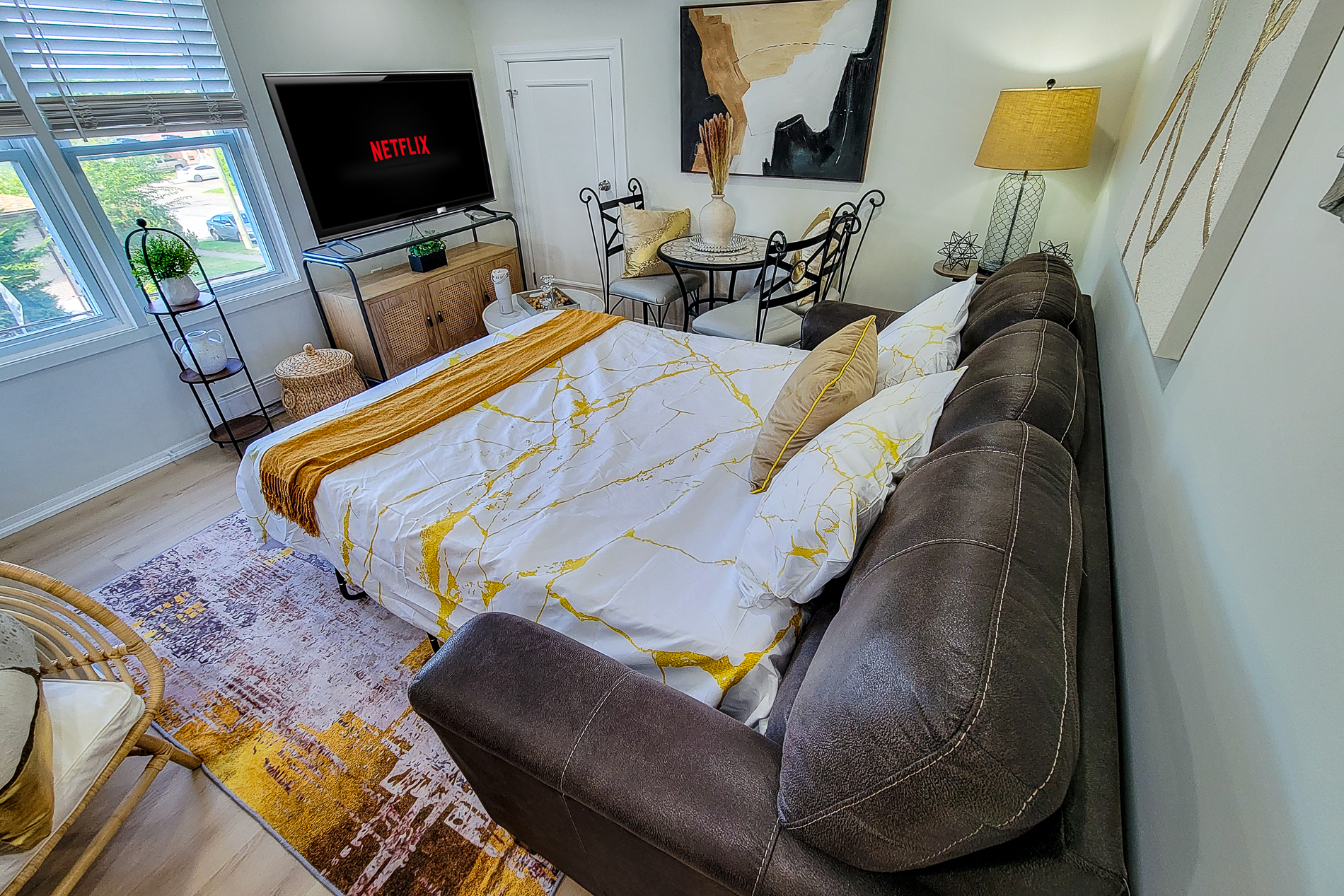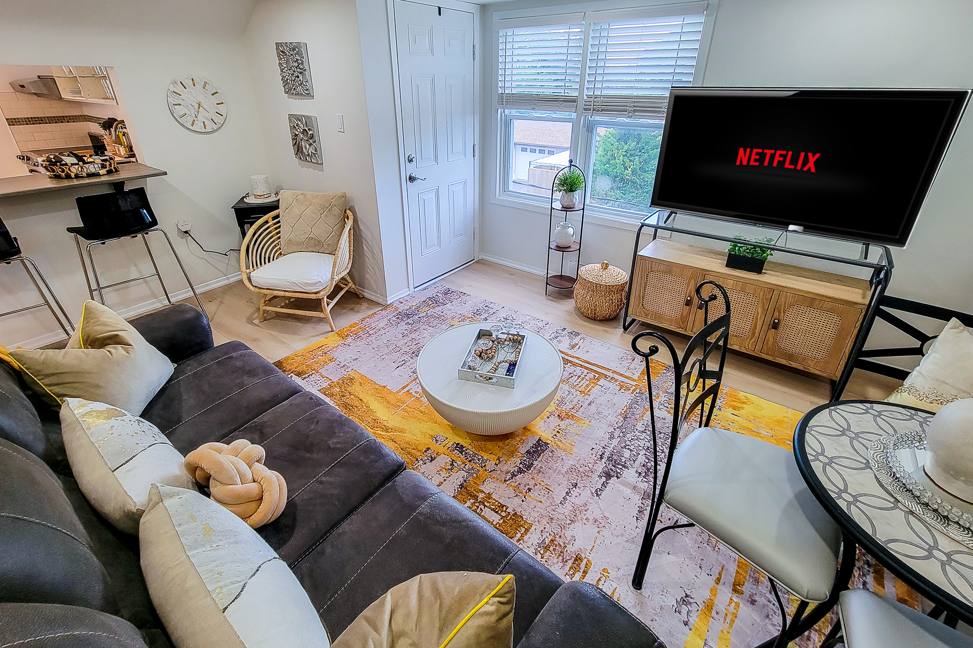 Our stunningly bright and airy 2-bedroom 1 bath suite offers a sophisticated hotel alternative that combines comfort & style. Furnished with thoughtful amenities, this boutique suite is perfect for couples, friends, singles, small families, business travelers, remote work, city relocators, or those in transition – offering amenities that you need to stay for a few days, a month or longer!